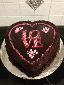 I made this cake for my hubby. It’s a chocolate sponge with a layer of strawberry jam covered with rich dark chocolate ganache and decorated with sprinkles, pink heart fondants, a plastic LOVE motif and more rich chocolate ganache . Yummmm!!
